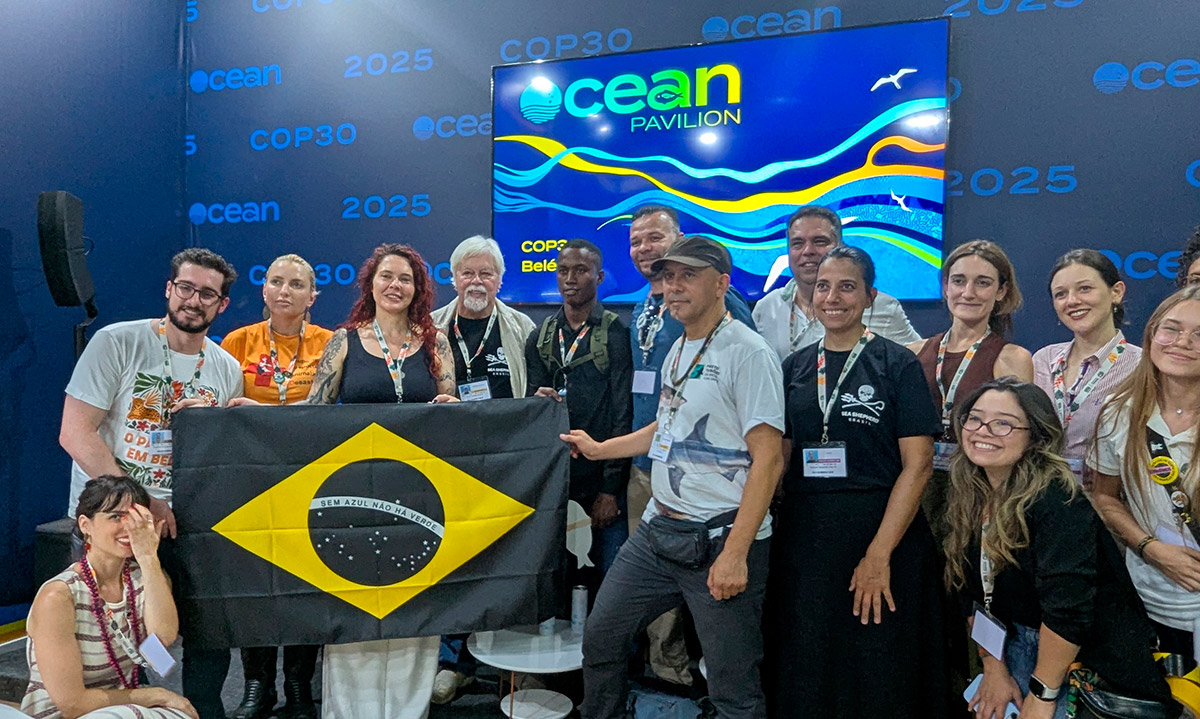 Photo de pose avec le drapeau de la coalition SOS Oceano au Pavillon Ocean de la Zone bleue de la COP30, à Belém.