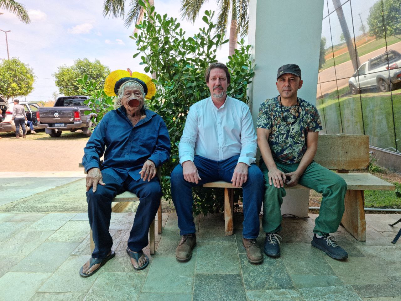 Thomas Waitz, entouré du Cacique Raoni et de Gert-Peter Bruch à Peixoto de Azevedo, pour la signature de la lettre — © Planète Amazone