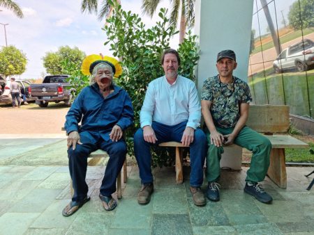 Thomas Waitz, entouré du Cacique Raoni et de Gert-Peter Bruch à Peixoto de Azevedo, pour la signature de la lettre © Planète Amazone